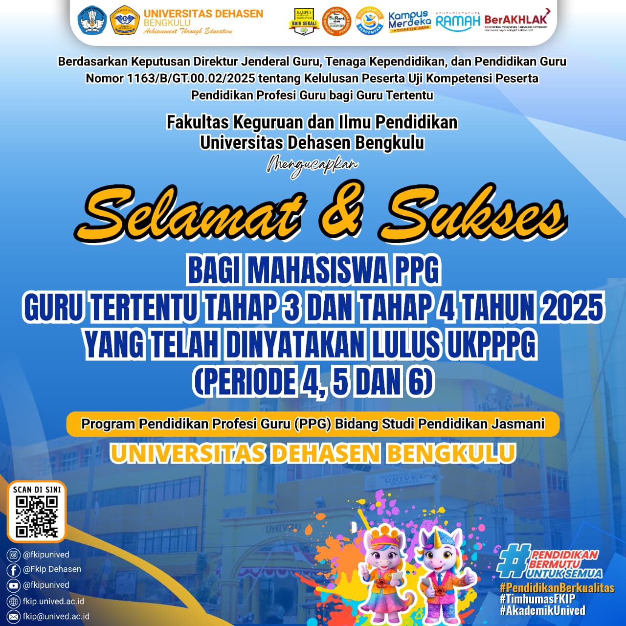 Universitas Dehasen Bengkulu mengucapkan selamat kepada mahasiswa Program Pendidikan Profesi Guru (PPG) Guru Tertentu Tahap 3 dan Tahap 4 Tahun 2025 yang telah dinyatakan LULUS Uji Kompetensi Peserta PPG (UKPPPG) pada Periode 4, 5, dan 6.
