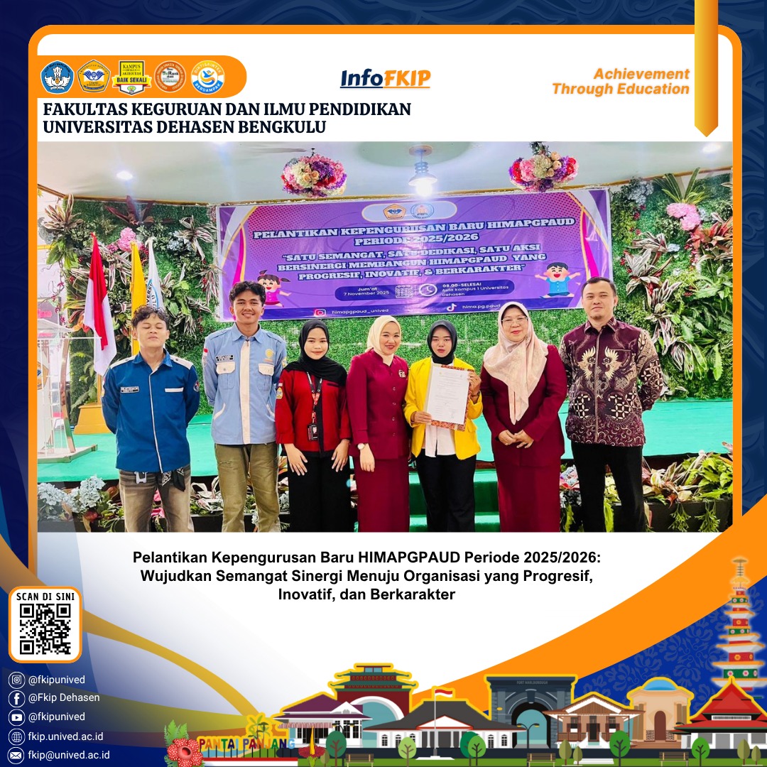 Bengkulu, 07 November 2025 — Himpunan Mahasiswa Pendidikan Guru Pendidikan Anak Usia Dini (HIMAPGPAUD) Universitas Dehasen Bengkulu resmi melaksanakan Pelantikan Kepengurusan Baru Periode 2025/2026 dengan mengusung tema “Satu Semangat, Satu Dedikasi, Satu Aksi Bersinergi Membangun HIMAPGPAUD yang Progresif, Inovatif, dan Berkarakter.”