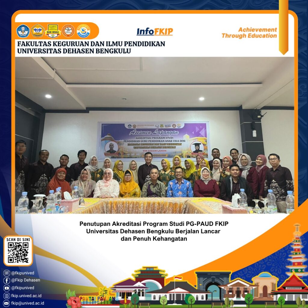 Acara penutupan dihadiri oleh Rektor Universitas Dehasen Bengkulu, jajaran Wakil Rektor, Dekan FKIP, Ketua dan Sekretaris Program Studi, para dosen, tenaga kependidikan, serta tim asesor BAN-PT, yakni Dr. Badru Zaman, M.Pd. selaku Asesor 1, dan Dr. Susilahati, M.Si. selaku Asesor 2. Kehadiran kedua asesor memberikan suasana akademik yang positif dan konstruktif bagi penguatan mutu Program Studi PG-PAUD.