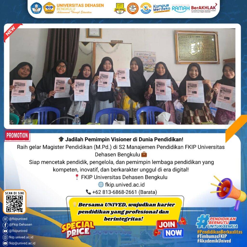 Program Studi S2 Manajemen Pendidikan FKIP Universitas Dehasen Bengkulu hadir untuk membentuk tenaga pendidik, pengelola, dan pemimpin lembaga pendidikan yang kompeten, inovatif, serta berkarakter unggul di era transformasi digital.