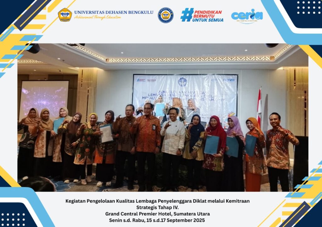 Medan, 15–17 September 2025 – Universitas Dehasen (UNIVED) Bengkulu melalui Fakultas Keguruan dan Ilmu Pendidikan (FKIP) kembali menunjukkan komitmennya dalam mendukung peningkatan mutu pendidikan anak usia dini. Hal ini ditandai dengan keikutsertaan dua perwakilan UNIVED dalam kegiatan Pengelolaan Kualitas Lembaga Penyelenggara Diklat melalui Kemitraan Strategis Tahap IV, yang diselenggarakan oleh Direktorat Guru Pendidikan Anak Usia Dini dan Pendidikan Nonformal (Dit. Guru PAUD dan PNF), Direktorat Jenderal Guru, Tenaga Kependidikan, dan Pendidikan Guru, Kementerian Pendidikan, Kebudayaan, Riset, dan Teknologi (Kemendikbudristek).